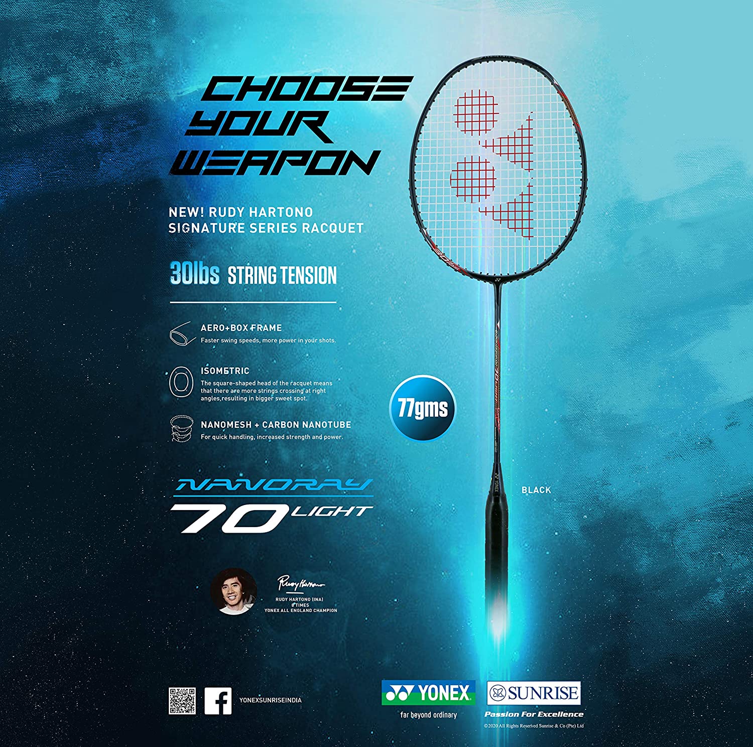 Nanoray 70 Light (endorsed by Rudy Hartono, an eight-time All-England Championship men’s singles winner) is a new and technologically advanced racquet which delivers fast handling and high repulsion, responding to high-speed rallies with lightning fast movement.